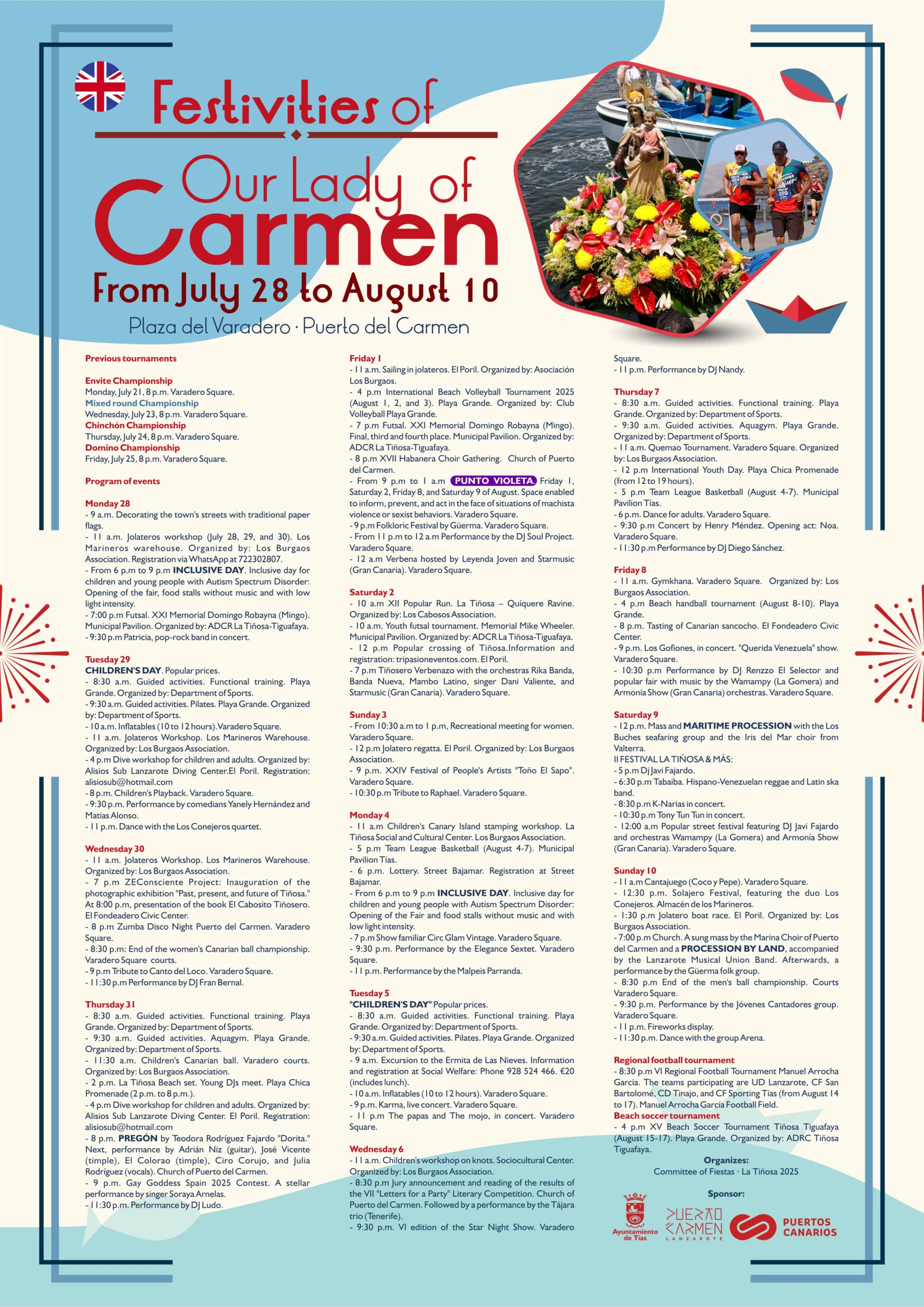 El pregón oficial, a cargo de Teodora Rodríguez Fajardo “Dorita”, se celebró ayer en la iglesia de Puerto del Carmen y en los días previos se han organizado actividades como el playback infantil, los encuentros juveniles, el torneos de bola canaria o los talleres de buceo. Durante los próximos días el escenario del Varadero acogerá una variada programación musical con artistas como Yaneli Hernández y Matías Alonso, Los Conejeros, tributo a El Canto del Loco, Fran Bernal, Adrián Niz, José Vicente, El Colorao, Ciro Corujo, Julia Rodríguez, Ludo, Güerma, Soul Project, Leyenda Joven, Starmusic, Rika Banda, Banda Nueva, Mambo Latino, Dani Valiente, tributo a Raphael, Circ Glam Vintage, Elegance Sextet, parranda Malpeis, Karma, The Papas and the Mojo, Nandy, Henry Méndez, Noa, Diego Sánchez, Los Gofiones, Renzo Selector, Wamampy, Armonía Show, Javi Fajardo, K-Narias, Tony Tun Tun, Jóvenes Cantadores y Arena.