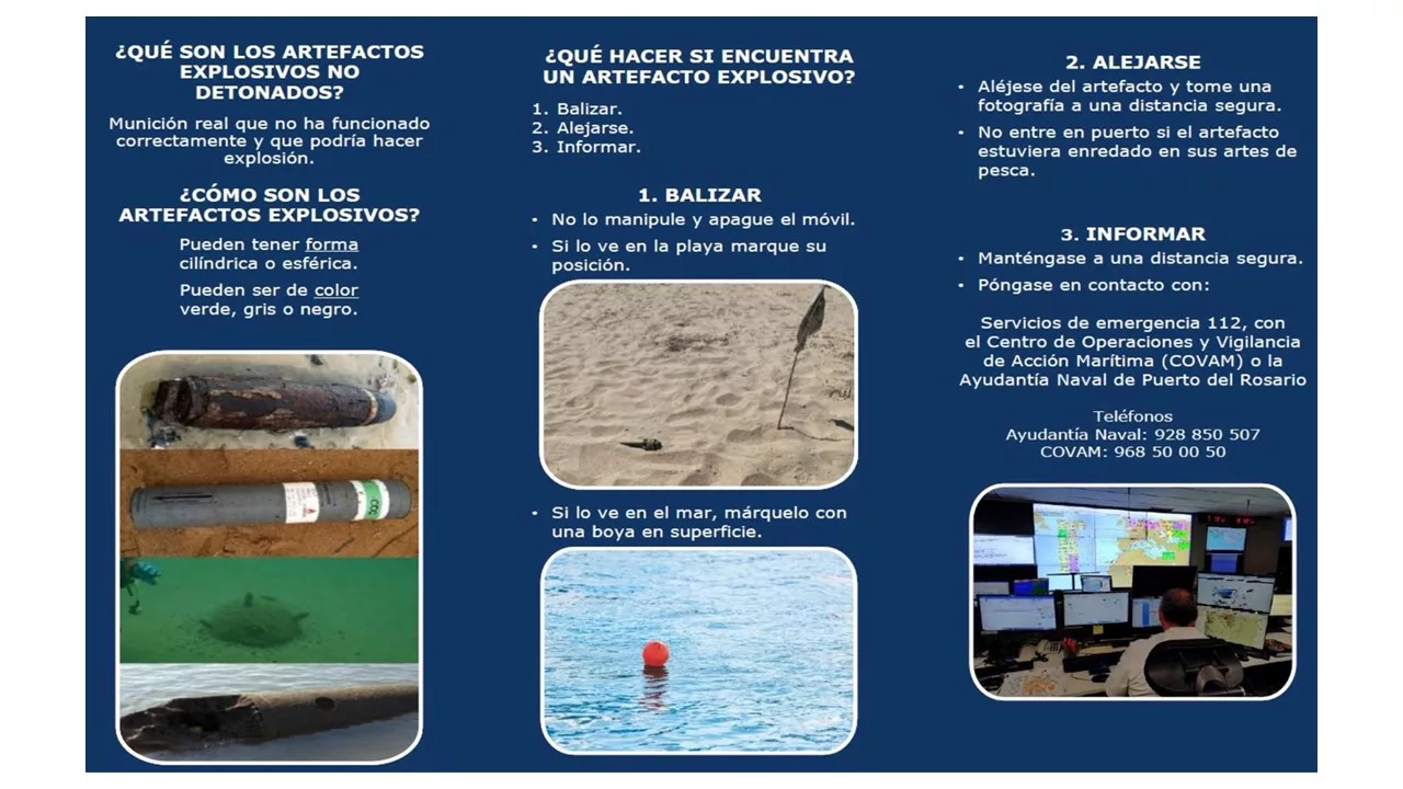 Esta semana los compañeros de Protección Civil de Tías asistieron a una jornada informativa organizada por la Armada en colaboración con el Consorcio de Seguridad y Emergencias de Lanzarote para informarse sobre las precauciones de seguridad con artefactos explosivos no detonados en el litoral y en el mar. Tal y como exponía la Armada y sin entrar en alarmismos innecesarios es importante que, ante la localización de cualquier artefacto, se les avise dado que disponen de grupos de especialistas en desactivación de explosivos, preparados y certificados, respaldados por el marco normativo vigente sobre seguridad, sin menoscabo de las competencias que en materia de seguridad ciudadana y policía judicial tengan atribuidas las Fuerzas y Cuerpos de Seguridad. Además, cuentan con una amplia experiencia nacional e internacional, siendo la capacidad para la desactivación de estos artefactos por todo el territorio nacional con un tiempo de reacción de menos de 24 horas. La colaboración de los ciudadanos es fundamental para la prevención y la seguridad, siguiendo siempre las indicaciones de las campañas informativas.