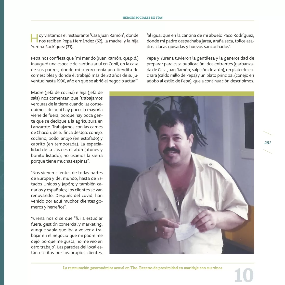 Como recordarán Casa Juan Ramón fue uno de los establecimientos que destacamos en el libro editado por el ayuntamiento, Revitalización del patrimonio cultural gastronómico, héroes sociales de Tías. Y lo hicimos porque primero Juan Ramón, y ahora su mujer e hija, Pepa y Yurena continúan con la cantina de Conil que él abrió, en la casa de sus padres donde tenían una tiendita de comestibles y donde Juan Ramón trabajó más de 30 años de su juventud hasta 1990, año en el que se inauguró Casa Juan Ramón.
