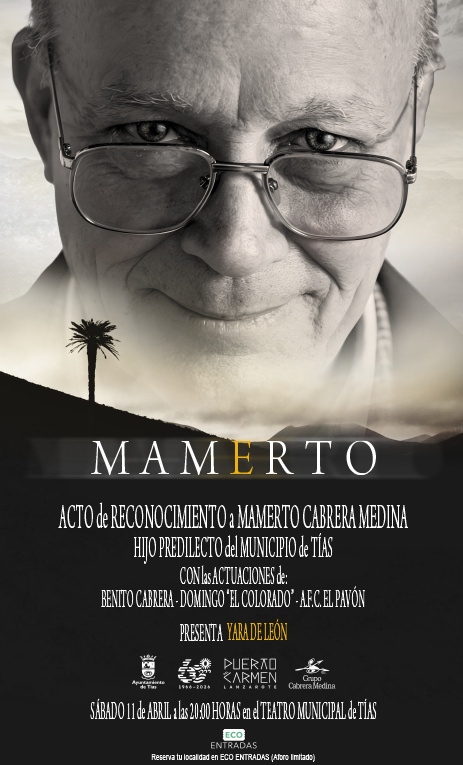 Como les adelantábamos en el anterior boletín, el Ayuntamiento de Tías conjuntamente con el grupo Cabrera Medina está organizando el próximo sábado, 11 de abril, un acto muy especial: el Reconocimiento a D. Mamerto Cabrera Medina, recientemente nombrado Hijo Predilecto de Tías por acuerdo plenario del 23 de febrero de 2026.