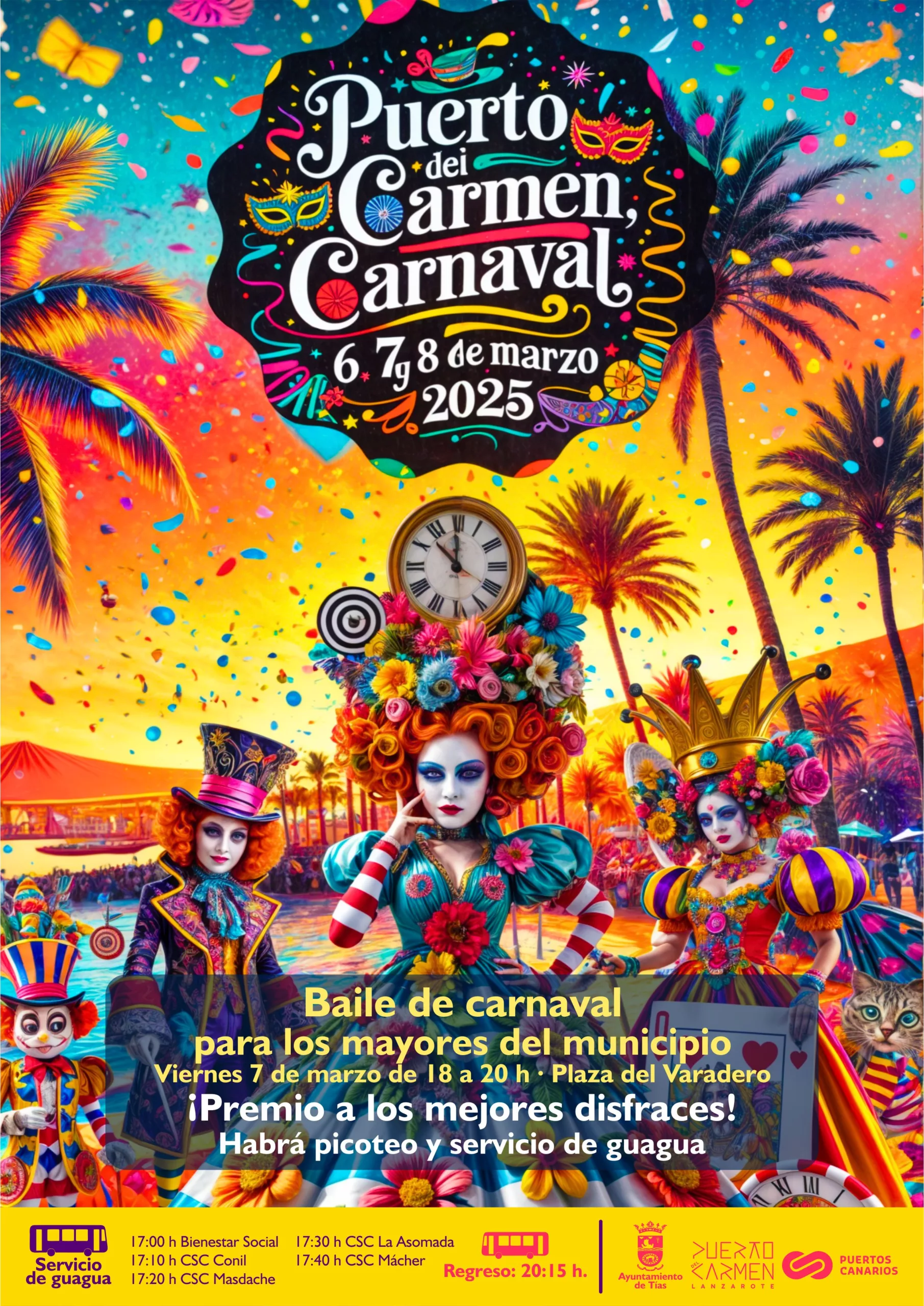 La concejalía de Festejos ya tiene todo preparado para que disfrutemos del Carnaval en Puerto del Carmen los días 6, 7 y 8 de marzo bajo la alegoría: Alicia en el país de las Maravillas. Tres días de diversión, color y buen rollo para todos los públicos, en donde podrás disfrutar de hinchables, talleres, actuaciones de comparsas, el pasacalles tradicional con la Parranda Los Buches desde Playa chica hasta la Plaza del Varadero, donde posteriormente se amenizará un baile para mayores y familias, Dj Renzzo el Selector, verbenas con las orquestas Mambo Latino, la Mekánica by Tamarindos y Maquinaria Band y como no, nuestro Gran Coso Carnavalero el sábado 8 de marzo a las 17:00 horas por la Avenida de las Playas.