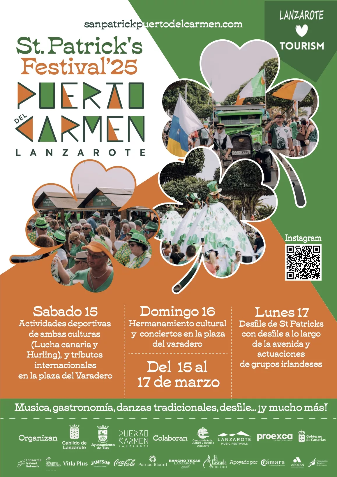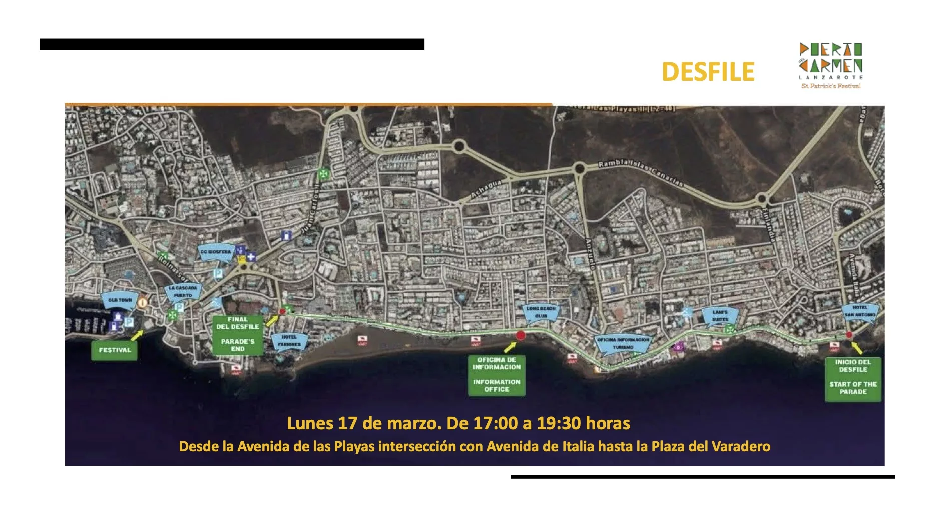 OJO A las 17:00 horas tenemos el Gran Desfile de San Patricio. Una caravana llena de color y música con carrozas, agrupaciones musicales, coches clásicos, club de moteros y muchas sorpresas. Será de 17:00 a 19:30 horas desde la Avenida de las Playas intersección con Avenida de Italia hasta la Plaza del Varadero.