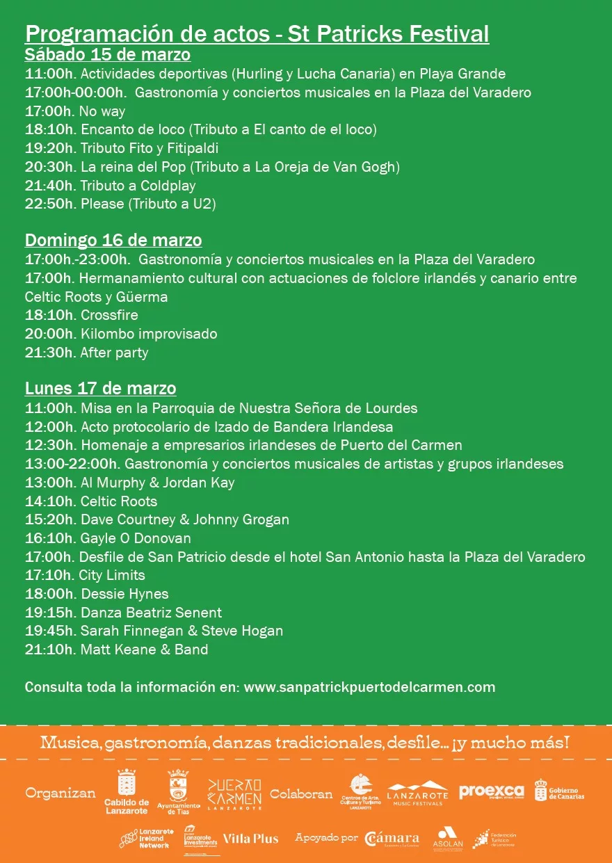 Mañana vuelve nuestro querido Festival de San Patricio, patrón de los irlandeses y uno de los mejores festivales del año en Lanzarote. Música en vivo, tanto de Irlanda como de la isla, bandas tributo, intercambio cultural de músicas folclóricas de aquí y de allá, buena gastronomía, juegos en la playa, impresionante desfile, actos protocolarios,…posiblemente una de los mejores celebraciones de Sant Patrick del mundo (fuera de Irlanda, claro) y que año tras año se va consolidando como una importante cita para residentes y para los que nos visitan.