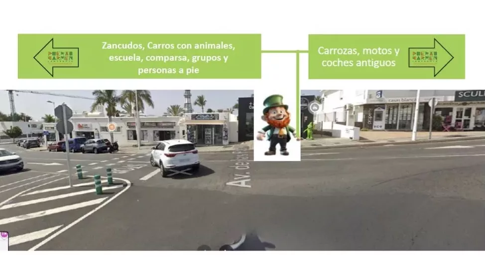 Como novedad este año queremos que el desfile llegue hasta la plaza del Varadero, así que al final de la avenida de las playas seguirán a pie las personas que participan en el desfile desviándose por la C./ Alegranza, C./ Isla de Lobos (Pasillo), C./ Tenerife hasta el Varadero. Las motos y coches antiguos se desviarán desde la Avenida por la C./ Timanfaya, rotonda Bisofera Plaza, C./ Roque Nublo, C./ Lanzarote y Plaza del Varadero.