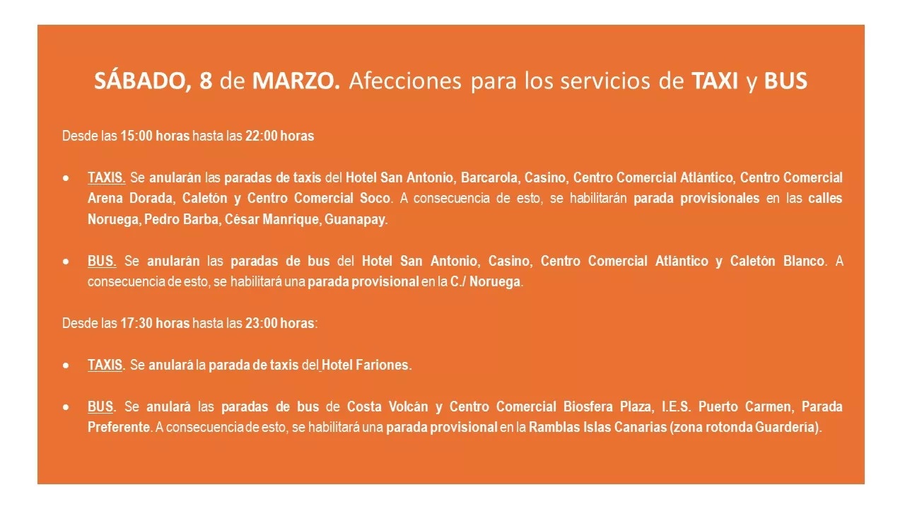 De esta forma la parada de taxis existente en la C./ Lanzarote queda anulada en el periodo comprendido entre 22:00 horas hasta las 03:00 horas del viernes 7 de marzo, trasladándose de forma provisional a la C./ Roque Nublo.