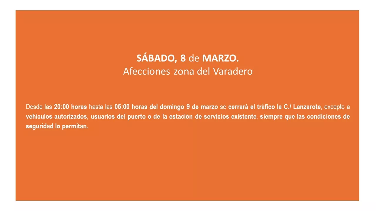 Desde las 21:00 horas hasta las 05:00 horas del sábado 8 de marzo, se cierra al tráfico la C./ Lanzarote, excepto a vehículos autorizados, usuarios del puerto o de la estación de servicios existente, siempre que las condiciones de seguridad lo permitan.