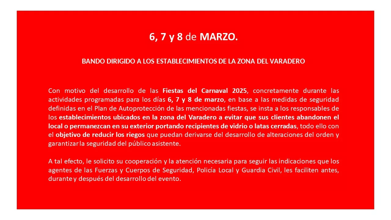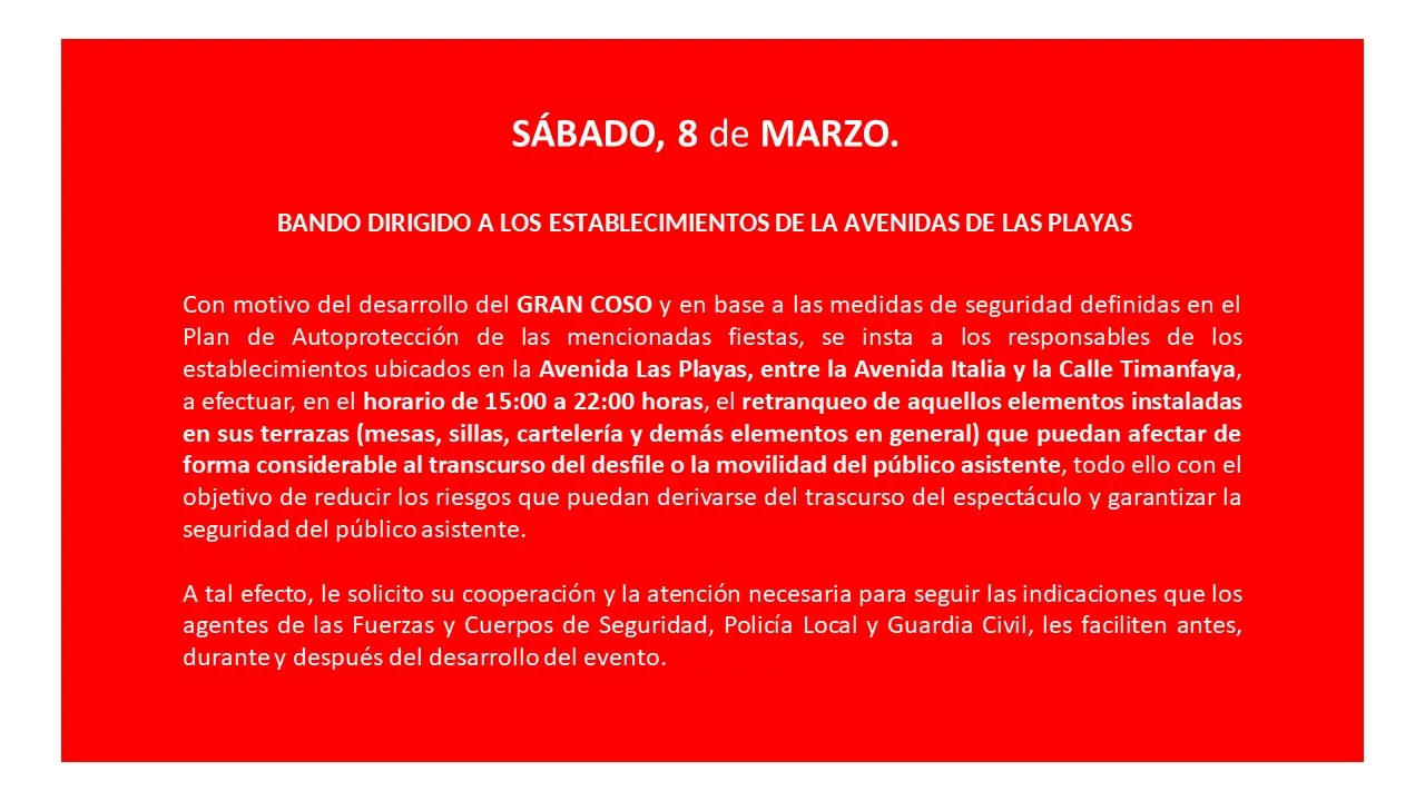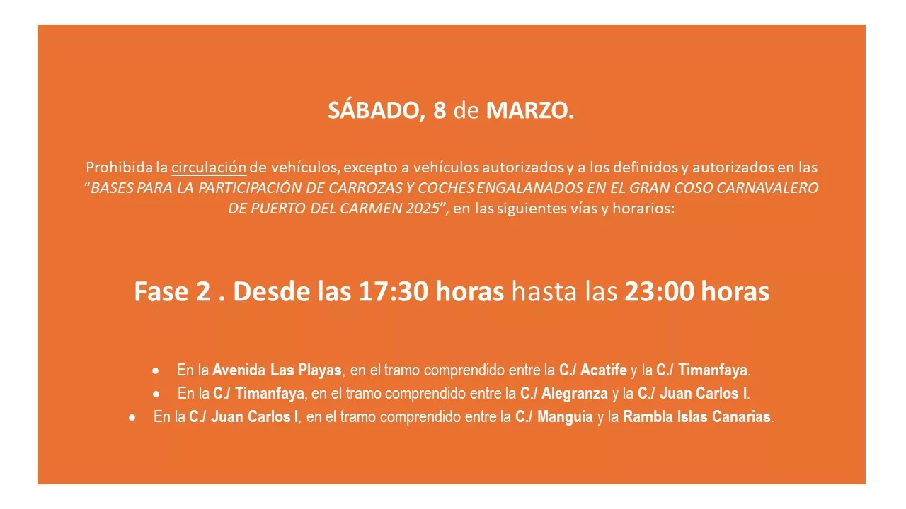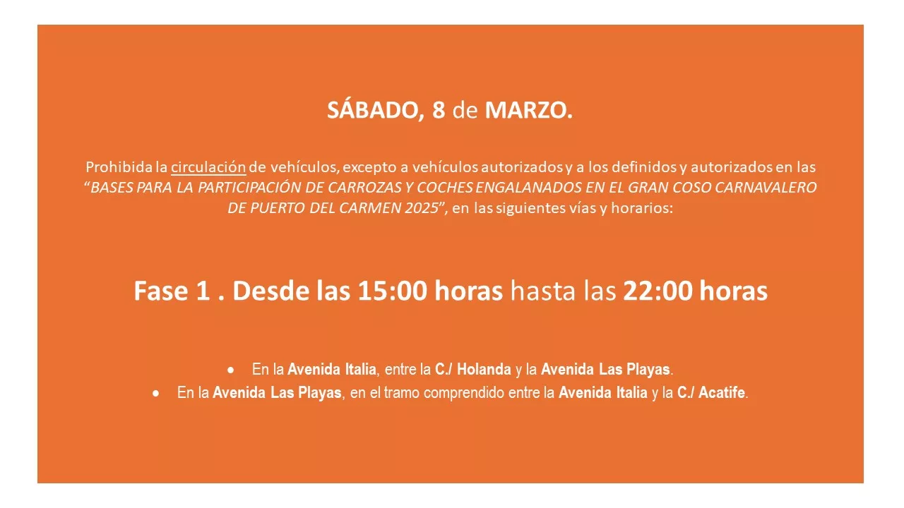 Desde las 22:00 horas hasta las 19:00 horas del sábado 8 de marzo. Prohibido estacionar en la Avenida Italia, en el tramo comprendido entre la Avenida Las Playas y la Calle Holanda, a fin de habilitar una zona reservada para el estacionamiento de los elementos autorizados en el Coso de Carnaval; así como se prohíbe el estacionamiento y la circulación en la C./ Suecia entre el tramo comprendido entre la C./ Portugal y la Avenida Italia a fin de ampliar la zona reservada para permitir el estacionamiento previo de dichos elementos.