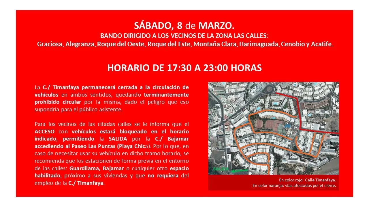 Desde las 22:00 horas hasta las 03:00 horas del viernes, 7 de marzo, se cierra al tráfico la C./ Lanzarote, excepto a vehículos autorizados, usuarios del puerto o de la estación de servicios existente, siempre que las condiciones de seguridad lo permitan.