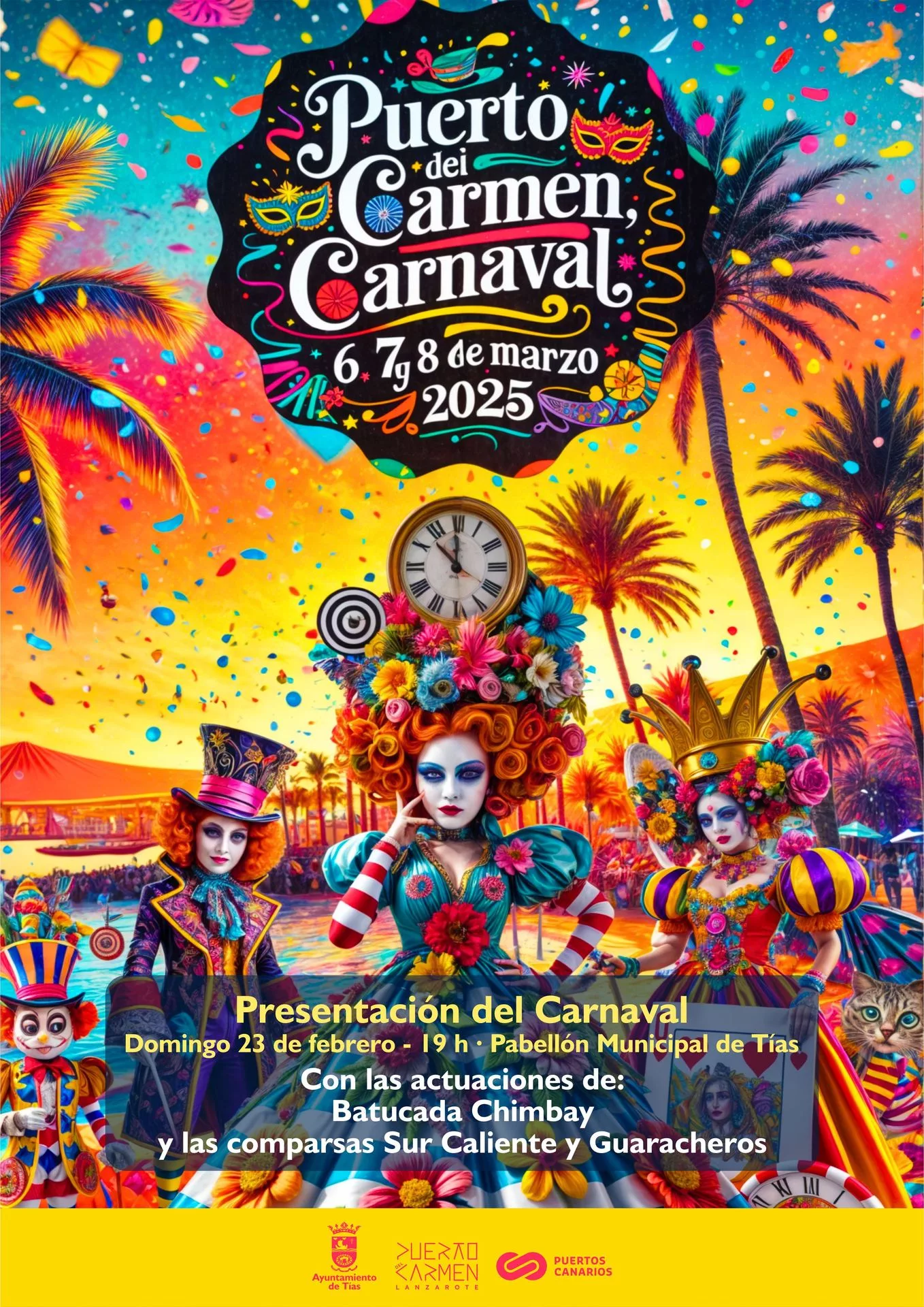 Este domingo, 23 de febrero, tendrá lugar la Presentación oficial en el Pabellón Municipal de Tías a las 7 de la tarde con las actuaciones de la Batucada Chimbay, la Comparsa Sur Caliente y Comparsa Guaracheros.