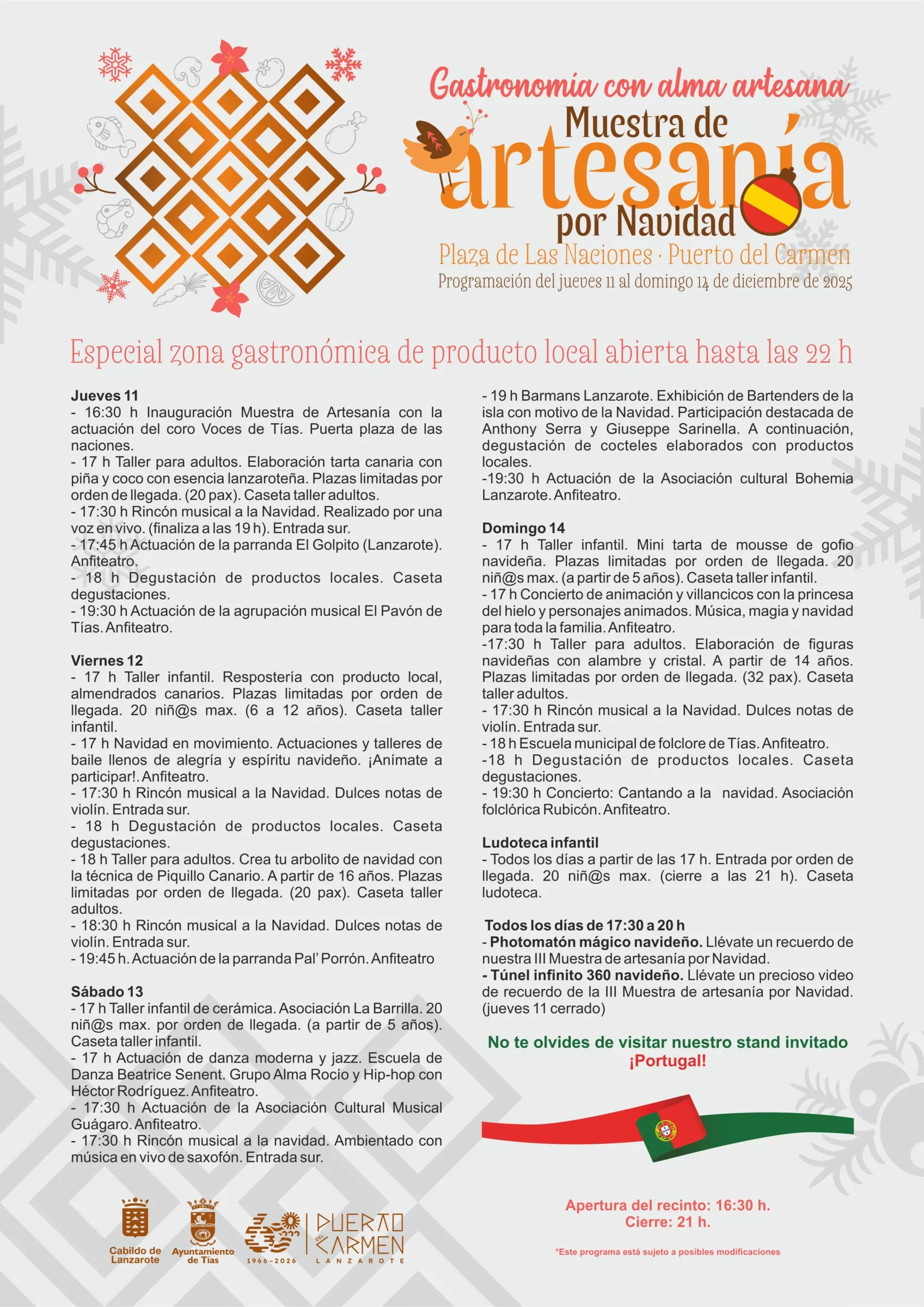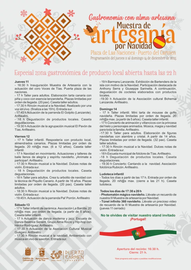 Puerto del Carmen se prepara para acoger, del 11 al 14 de diciembre, la III Muestra de Artesanía por Navidad “Gastronomía con alma artesana”, un evento que convertirá la Plaza de las Naciones en un gran espacio dedicado a los sabores, tradiciones y oficios que llenan de identidad estas fechas tan especiales.