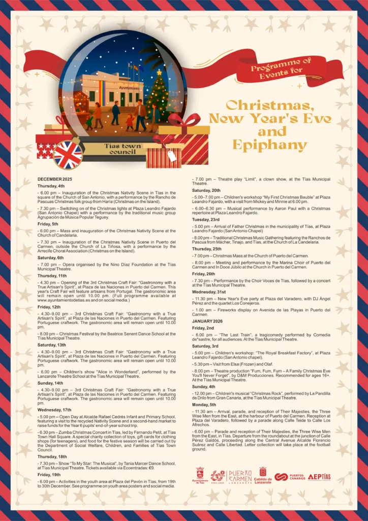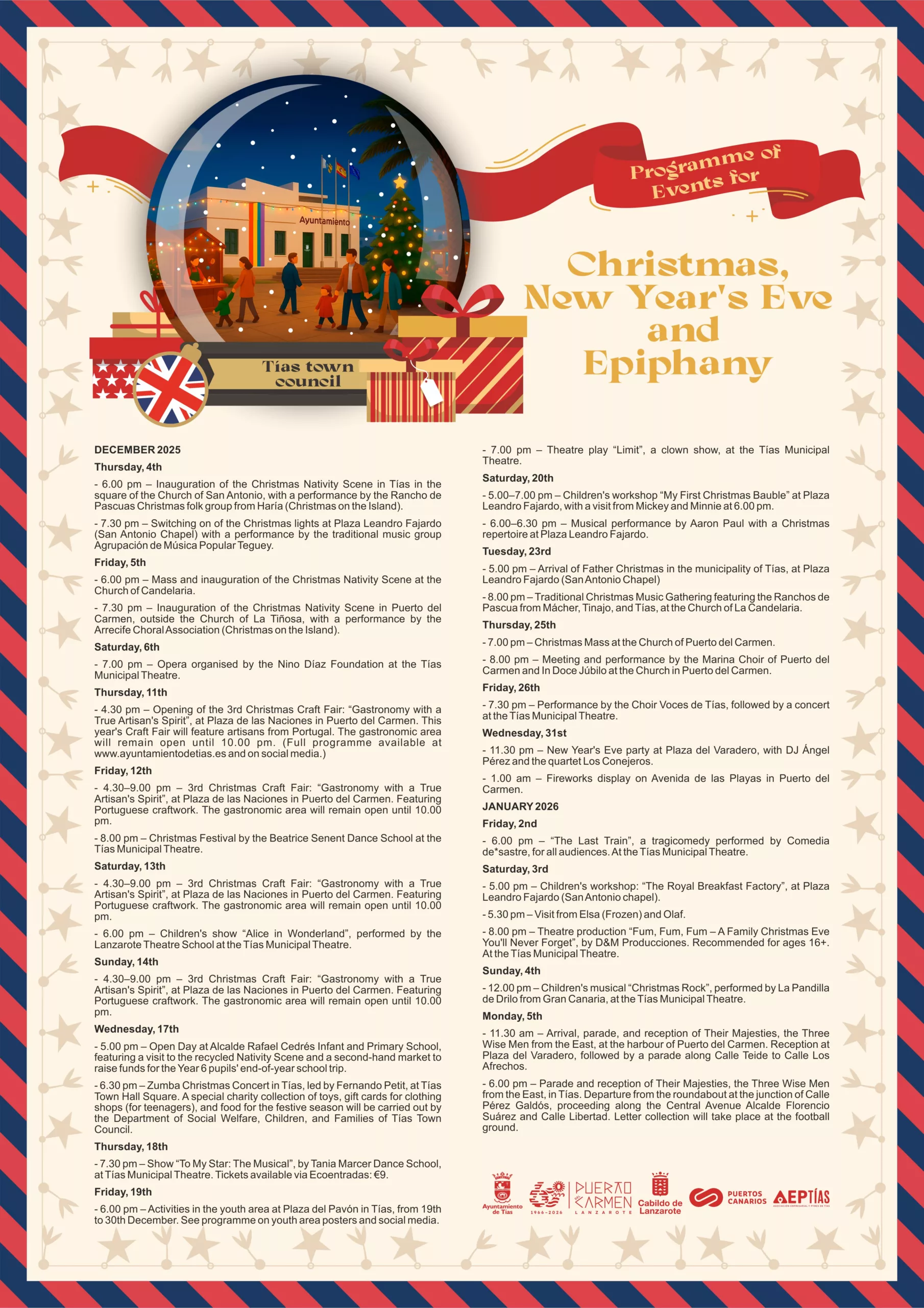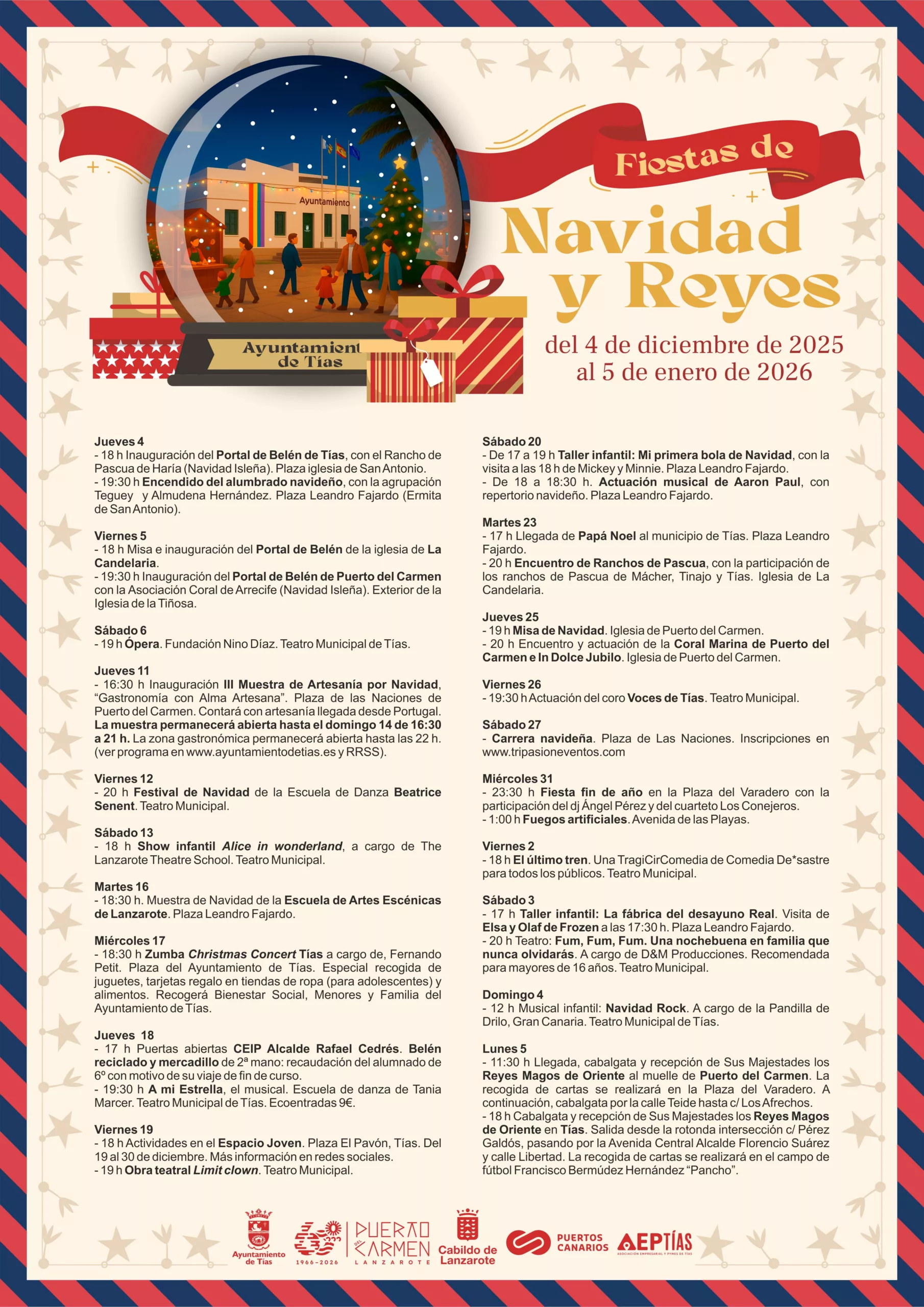 Las fiestas, organizadas con la colaboración de la Asociación Empresarial y Pymes de Tías (AEP Tías), culminarán el 5 de enero con la llegada de Sus Majestades los Reyes Magos, que recorrerán las calles de Tías y Puerto del Carmen repartiendo ilusión entre niños y adultos, como cada año.