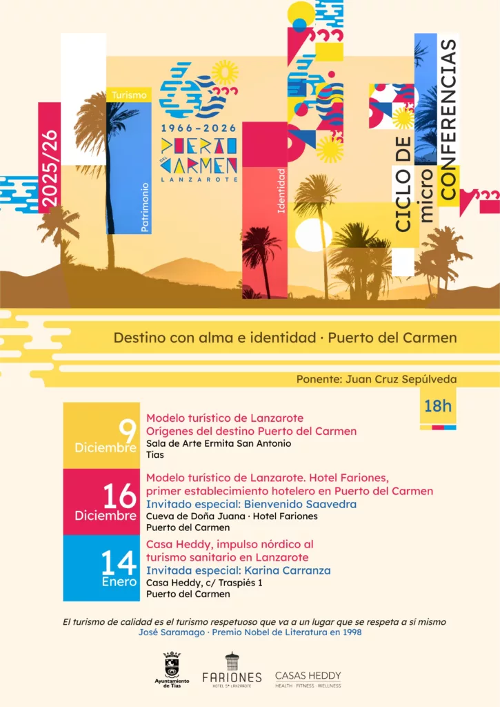 Desde el área de Turismo hemos organizado el Ciclo de Conferencias: Destino con Alma e Identidad — Puerto del Carmen con motivo del 60º aniversario del destino (1966-2026) con un objetivo claro: dar a conocer y profundizar en seis décadas de transformación, poniendo en valor la historia, la identidad y el modelo de desarrollo que han convertido a Puerto del Carmen en uno de los enclaves turísticos más emblemáticos de Lanzarote.